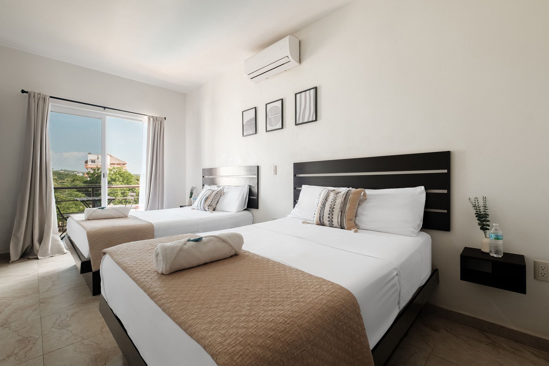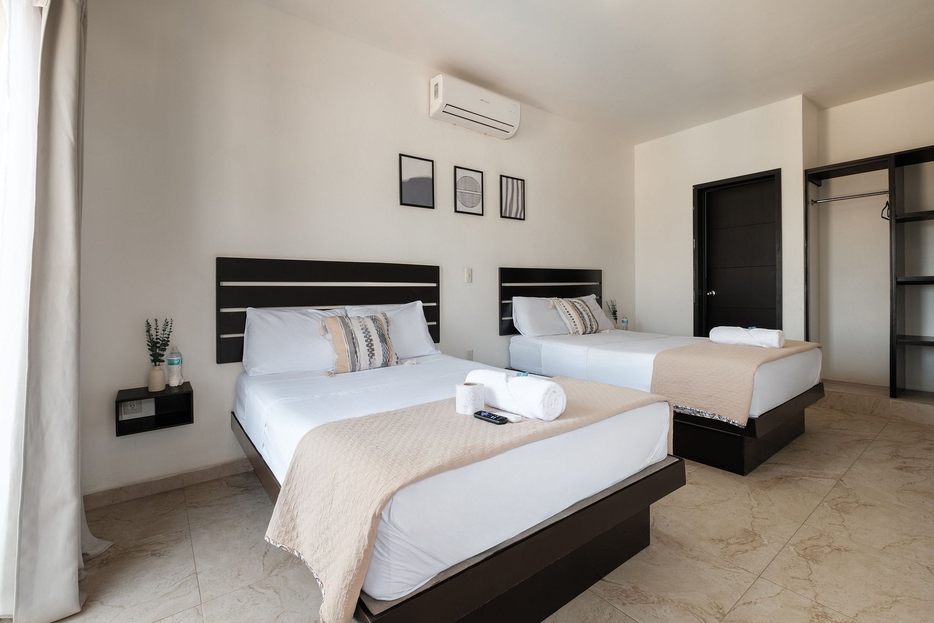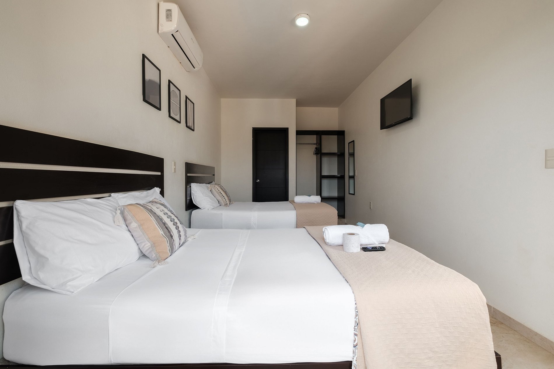 Esta habitación de hotel incluye dos cómodas camas matrimoniales/dobles, aire acondicionado, agua caliente, televisión inteligente e internet.
